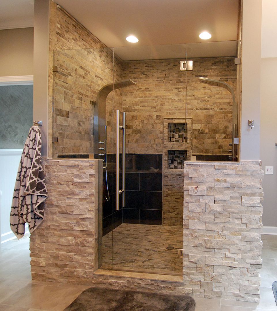 Los paneles de vidrio con forma de Zig Zagged se ajustan a presión en la abertura para crear un espectacular diseño de ducha. Los bordes de los paneles de vidrio estaban entallados para un ajuste perfecto en las esquinas. Aquí se usaron tres bisagras, pero generalmente no son necesarias en la mayoría de las situaciones.