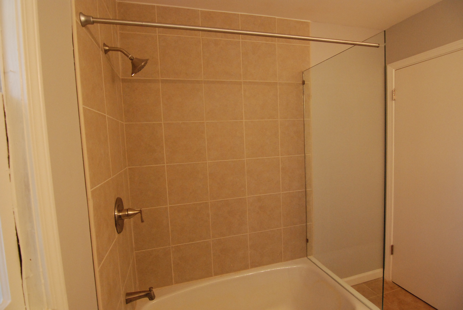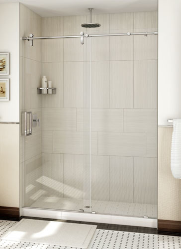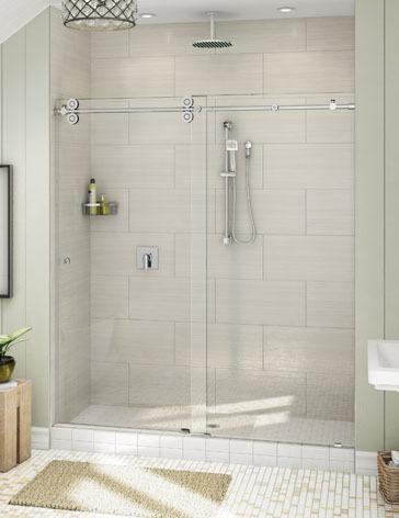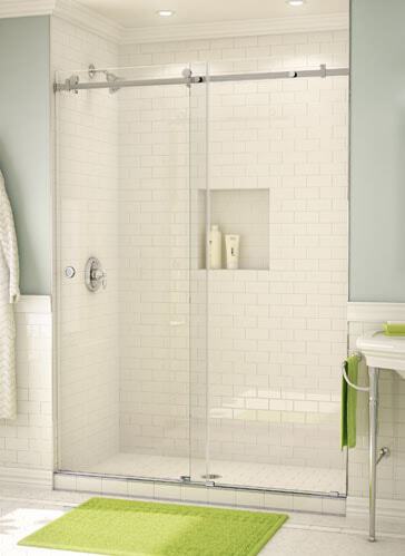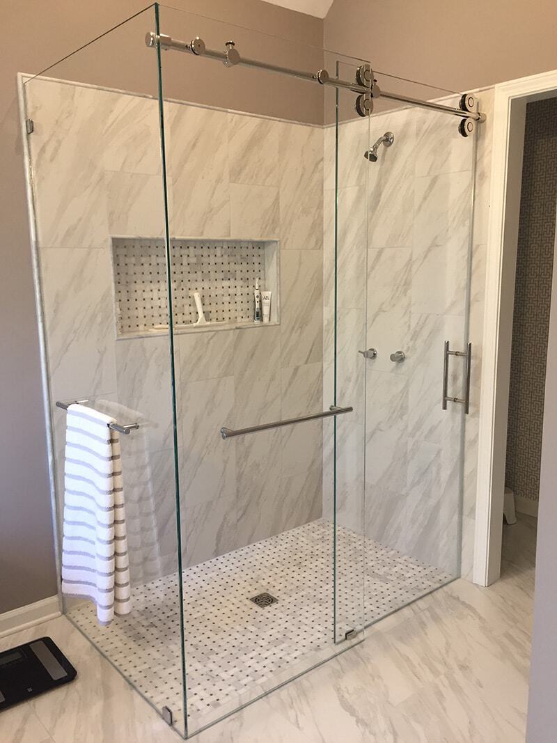 Este es un gran ejemplo de actualización del baño y la ducha al quitar el viejo recinto y reemplazarlo con un nuevo recinto de ducha sin marco. Los estilos de hardware en cromo y níquel cepillado se ven muy bien con baldosa blanca.